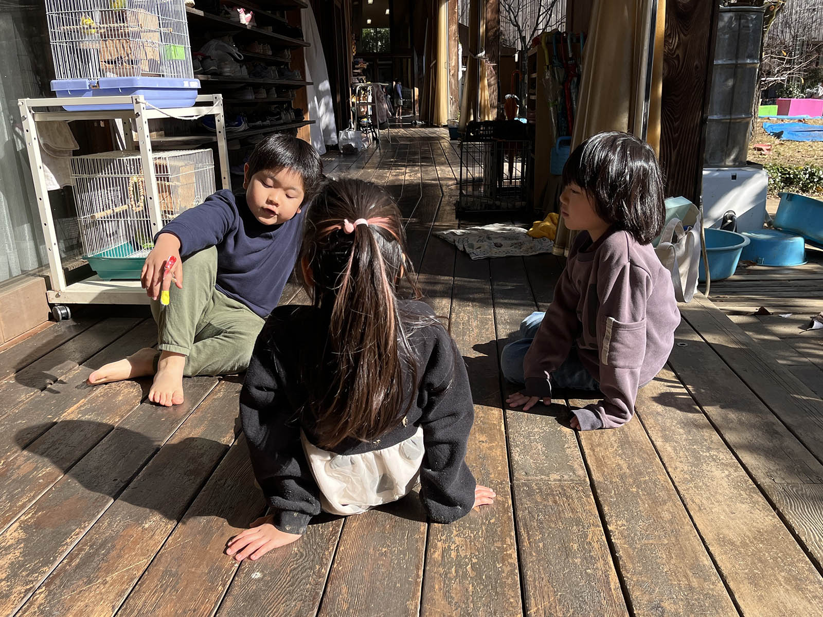 いつものように、園舎のテラスで日向ぼっこをする園児たちもいて、微笑ましく、面白い。