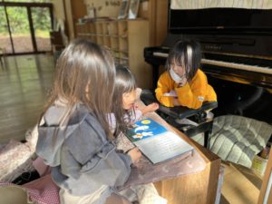 ひらがなを習ってないのにせなけいこの「おばけ」の絵本を友だちと協力して読解している