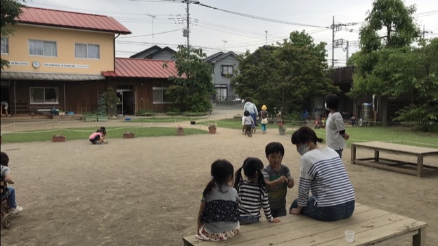 園庭の芝生が青々と成長してきました。木々の新緑もまぶしい園庭で、子どもたちものびのびと遊び、育っています。