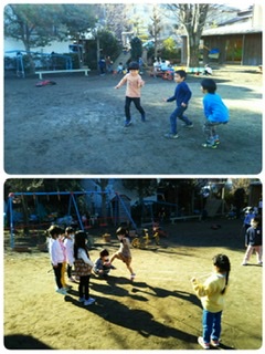 | 毎朝の日課、あたたかくなる体操。 ここ数日は新しい体操もラインナップに加わりました。 (チェケマッチョ体操といえばわかる卒園児の人もいるかな?) 体操のあとはホカホカした身体で外遊びが盛り上がります。 年中は、靴飛ばし。 年長は、いろはにこんぺいとうというゴム遊び。 どちらも楽しそうでした。 ![]() |